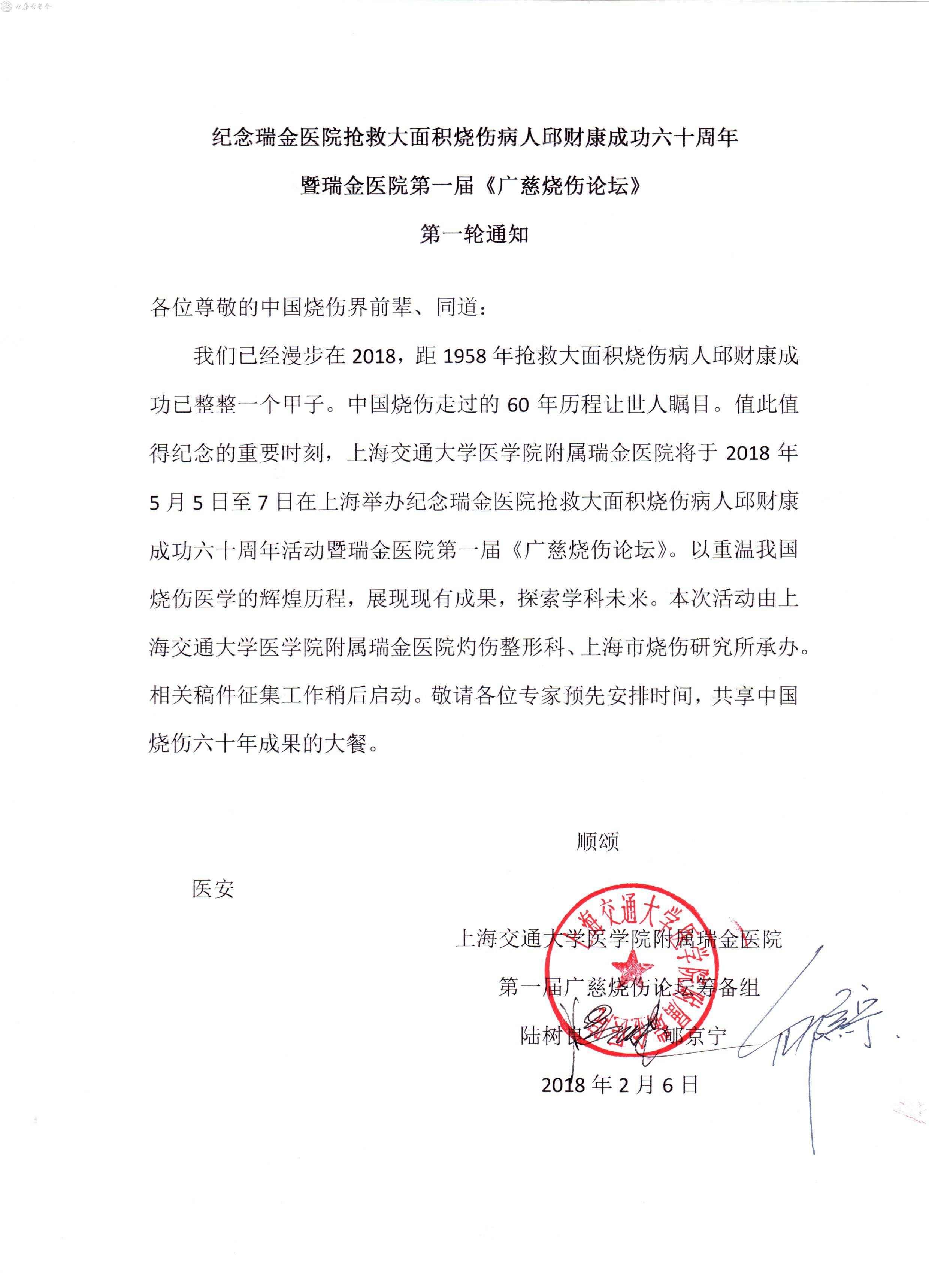 纪念瑞金医院抢救大面积烧伤病人邱财康成功六十周年暨瑞金医院第一届《广慈烧伤论坛》第一轮通知