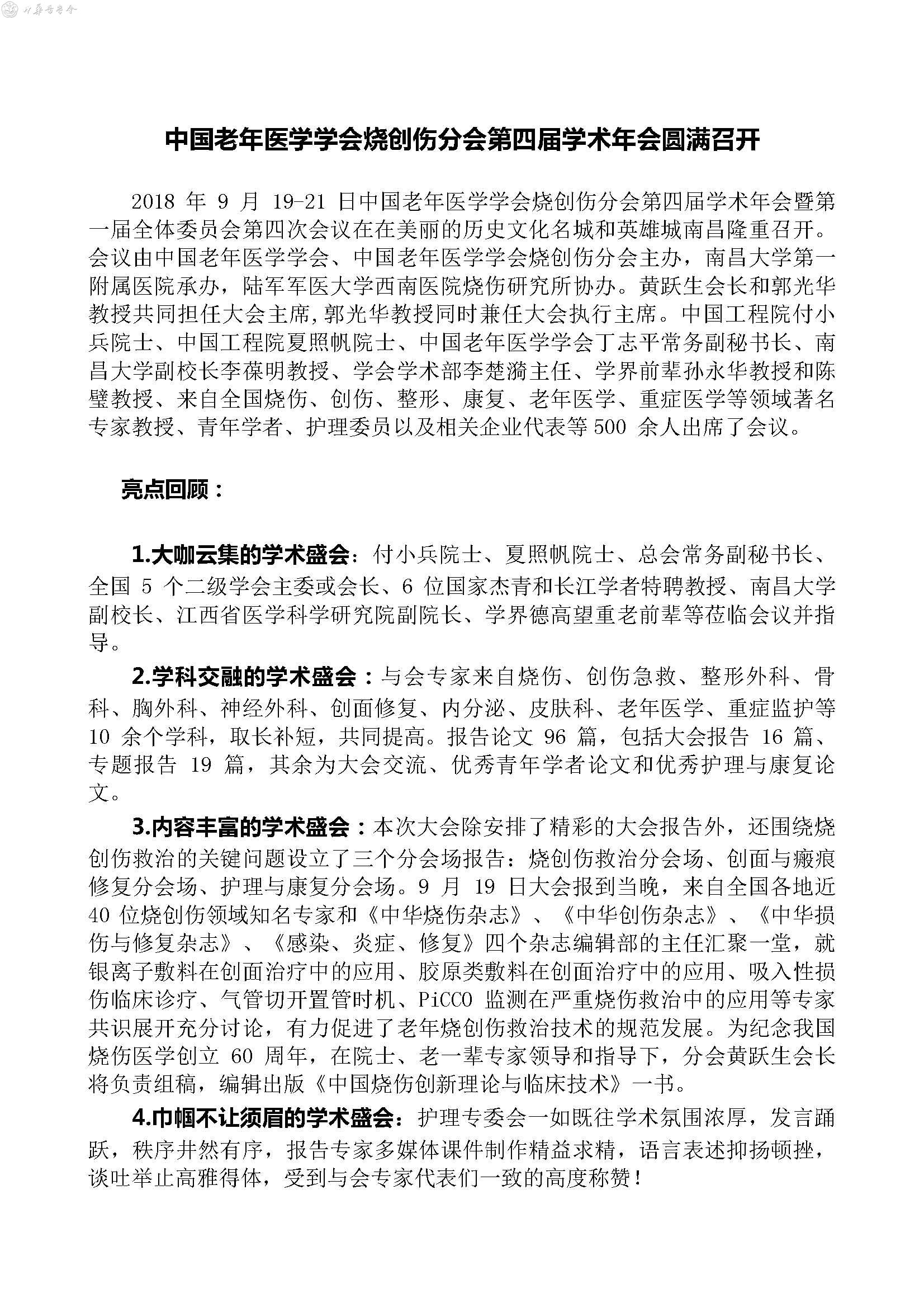 2018中国老年医学学会烧创伤分会第四届学术年会会讯(终稿)