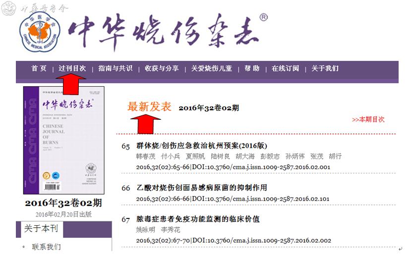 你们好!《中华烧伤杂志》2016年1、2期已经出版,为了更好配合杂志内容的传播,在中华医学会杂志社的鼎力支持下,本刊杂志网站全新改版升级。改版后网站首页即可看到最新发表期次文章列表,方便您及时查阅本刊新近发表文章。您还可以点击“最新发表”上方的“过刊目次”栏目,浏览本刊往期发表文章。